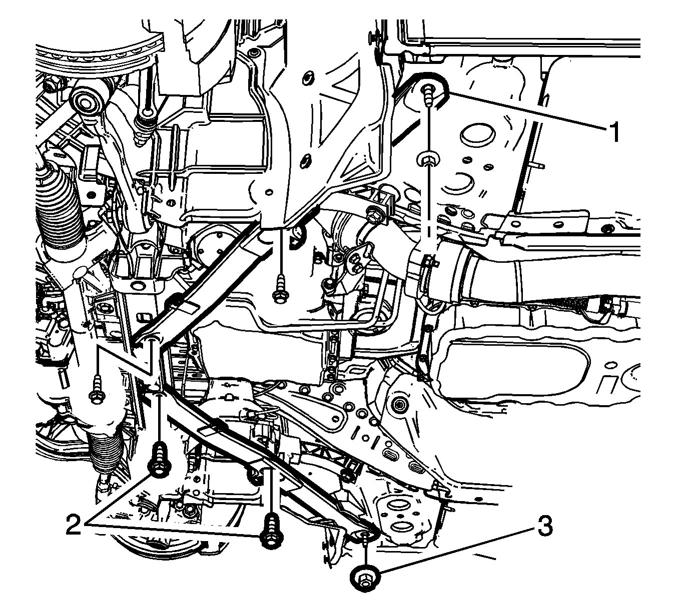 8.Remove the lower noise shield. Refer to Engine Compartment Lower Noise Shield Replacement .