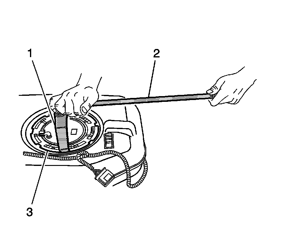 7. Use the J 45722 - fuel sender lock ring wrench (1) and a long breaker-bar (2) to install the fuel tank module lock ring (3), by turning clockwise, until fully seated.