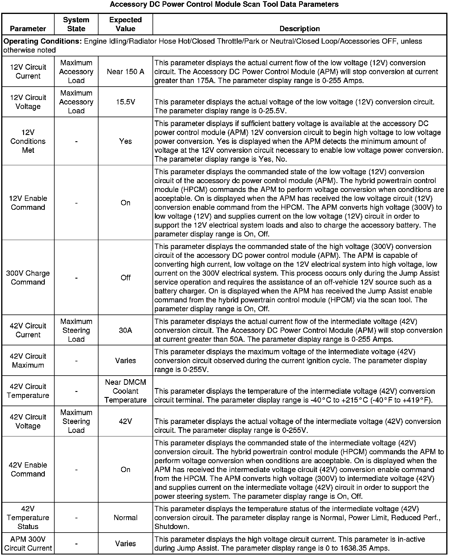 The scan tool values from a properly running vehicle may be used for comparison with the vehicle you are diagnosing. The Accessory DC Power Control Module Scan Tool Data Parameters list represents values that would be seen on a normally running vehicle.