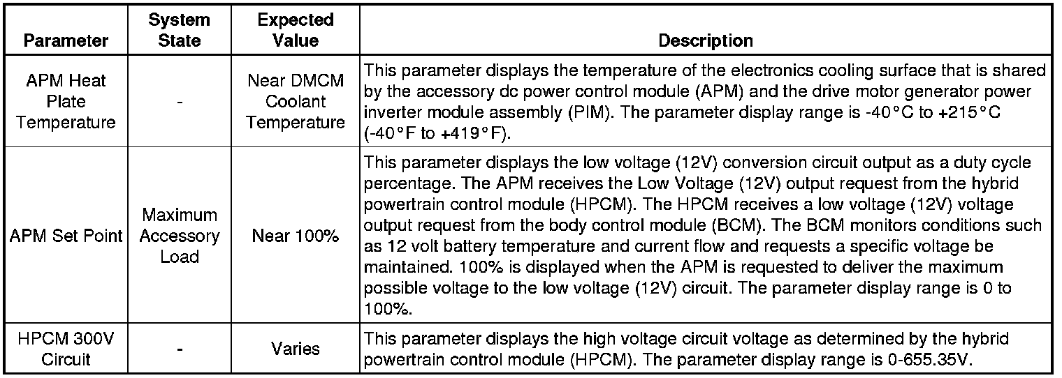 Only the parameters listed below are referenced in this service manual for use in diagnosis. If all values are within the typical range described below, refer to Symptoms - Hybrid Controls for diagnosis.