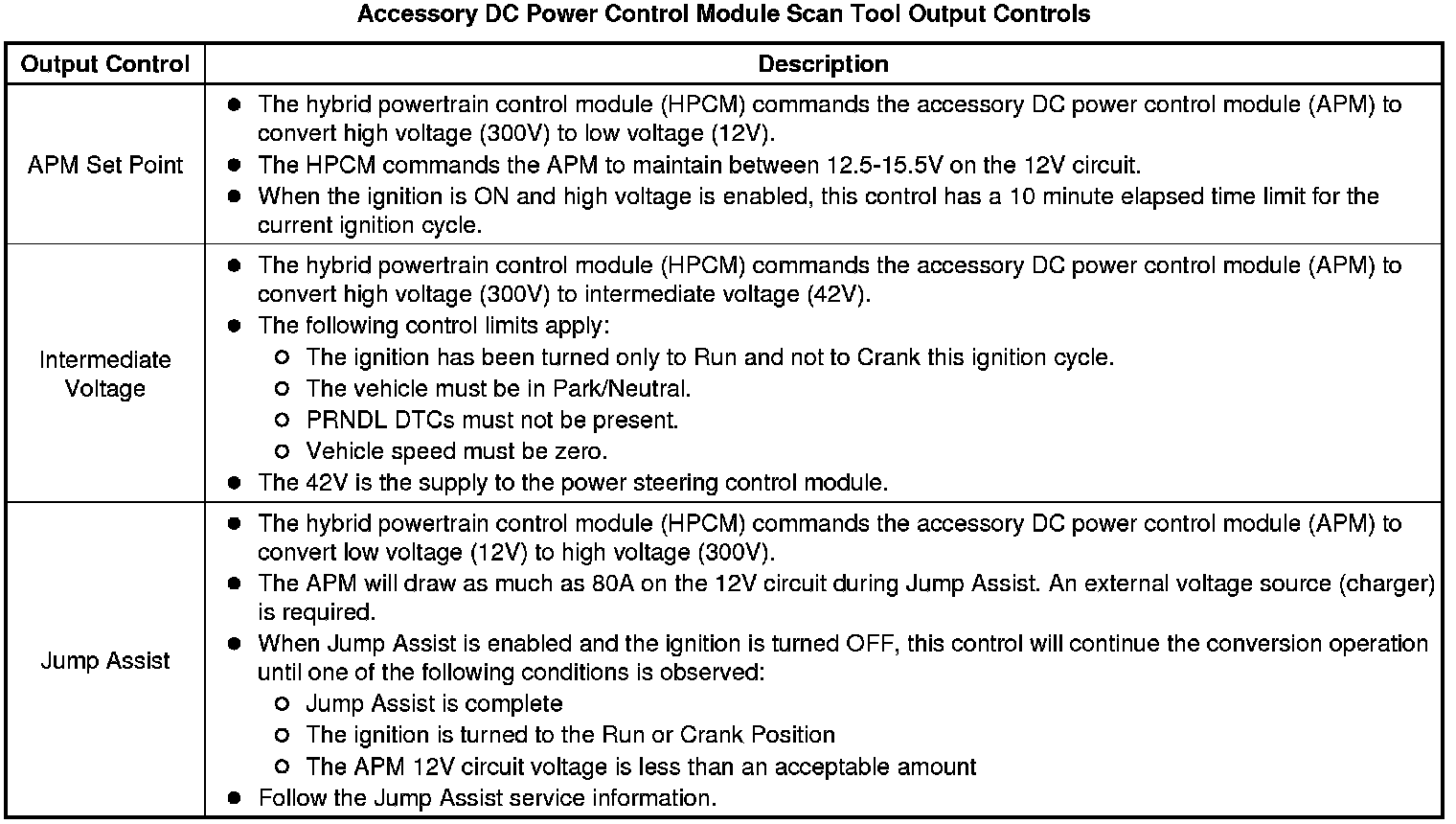 The Accessory DC Power Control Module Scan Tool Data Parameters list contains hybrid controls-related parameters. The list is arranged in alphabetical order.