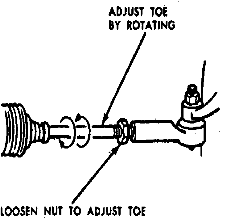 Toe-in can be adjusted by loosening the clamp bolts at each end of each tie rod and turning each tie rod to increase or decrease its length as necessary until proper toe-in is secured and the steering gear is on the high point for straight-ahead driving.Fig. 6.