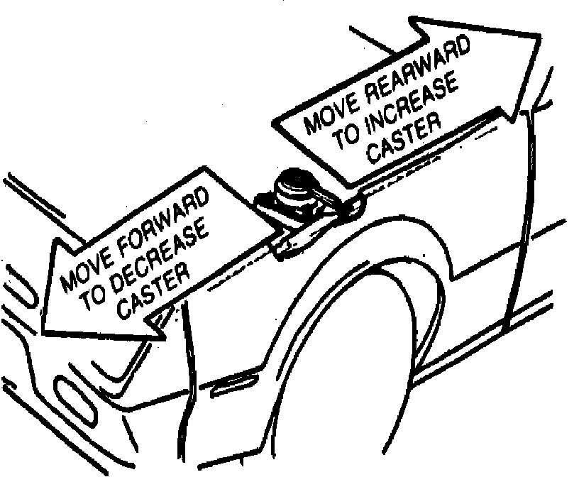 Caster adjustments are made by moving the position of the upper strut mount assembly. Fig. 3.To make adjustment, remove dust cap and fender bolt and attach tool J-29724 to original fender bolt, Fig. 4. Tighten the turnbuckle and loosen the three strut mount attaching nuts.