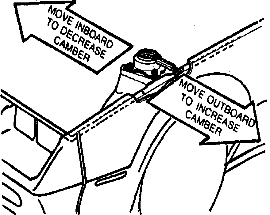 Camber adjustments are made by moving the position of the upper strut mount assembly.Fig. 5.. To make adjustment, remove dust cap and fender bolt and attach tool J-29724 to original fender bolt, Fig. 4. Tighten the turnbuckle and loosen the three strut mount attaching nuts.