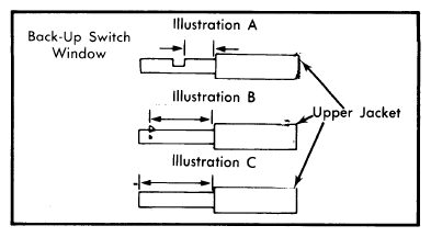 Inspect jacket section of column for looseness, bends, collapsed mesh or bellows section. With General Motor's models, check for mast jacket collapse by measuring the distance from edge of the back-up switch window to the lower edge of upper jacket. See Figure for proper dimensions.
