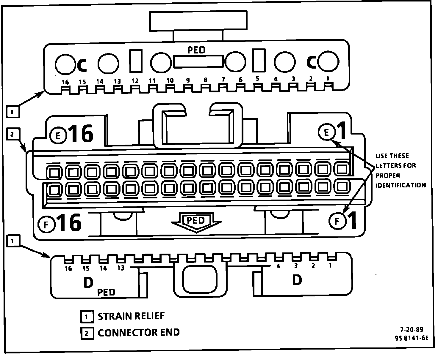 Currently a common strain relief is used in both the C-D 32 pin and the E-F 32 pin connectors. To properly identify these connectors, the strain reliefs must be removed. Use the lettering on the connector as shown on figure.