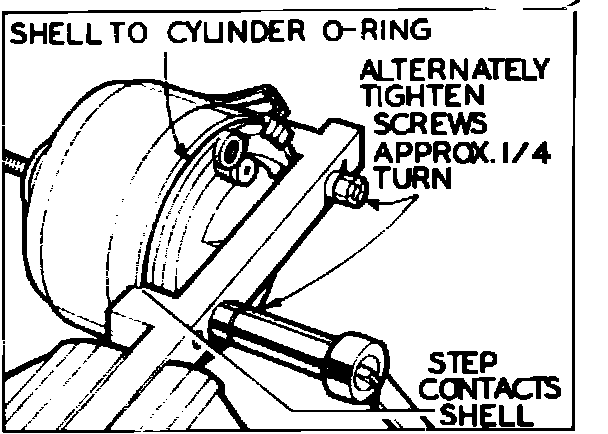 3. Alternately tighten fixture bolts approximately 1/4 inch to push shell free of cylinder O-rings, Fig. 24, then remove shell.