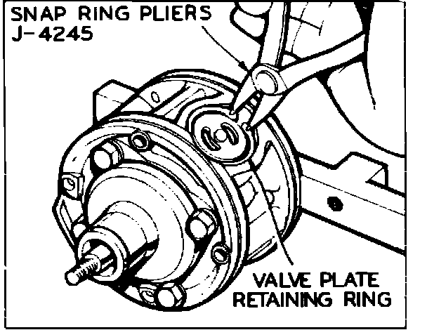 4. Remove valve plate retainer snap ring with tool J-4245, Fig. 25, then compressor valve plate, Fig. 26.