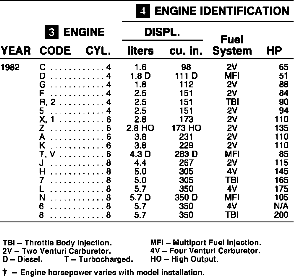 [4] ENGINE IDENTIFICATION: On the line where the engine code appears, read to the right to identify the engine.