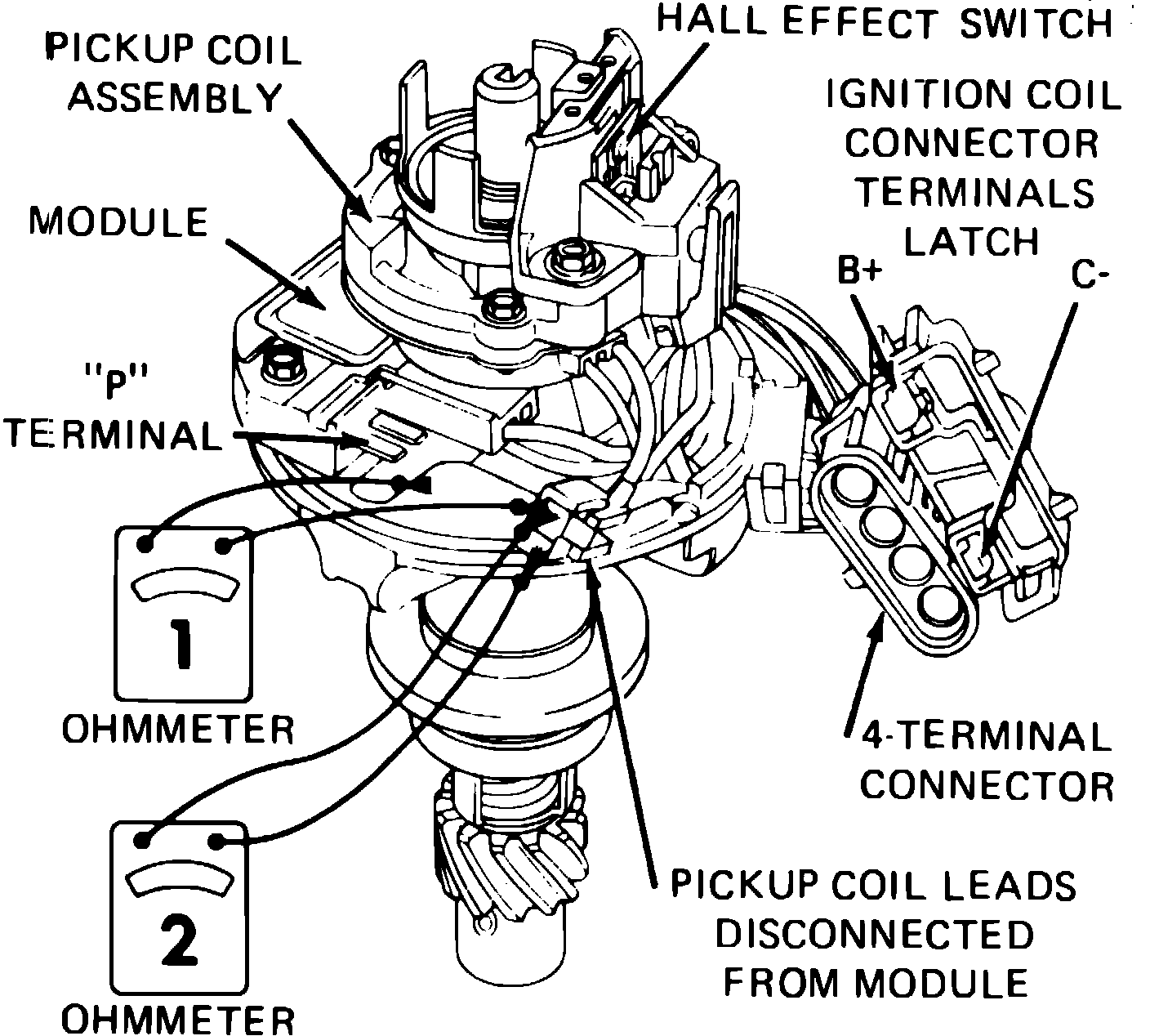 1. Remove distributor rotor, then disconnect pickup coil leads from module.