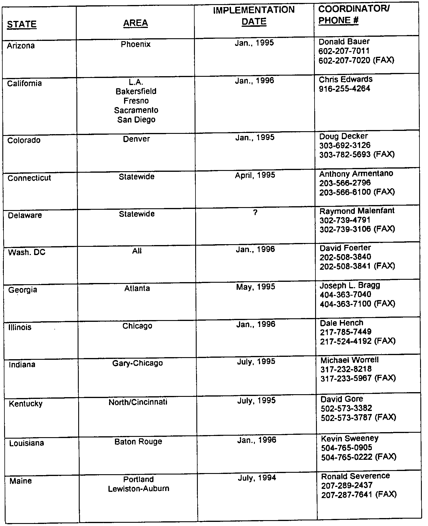 Illustrated are those states which will participate in the Enhanced Emission program as well as a state contact and phone number. In most cases, the test program will be limited to major-urban areas, although some states have elected to implement a statewide program. To ascertain if your facility is affected by this program, refer to the attached list which details those areas affected by the lM240 program along with the projected start dates as declared by each state. Check with your local environmental agency to obtain more detailed information.