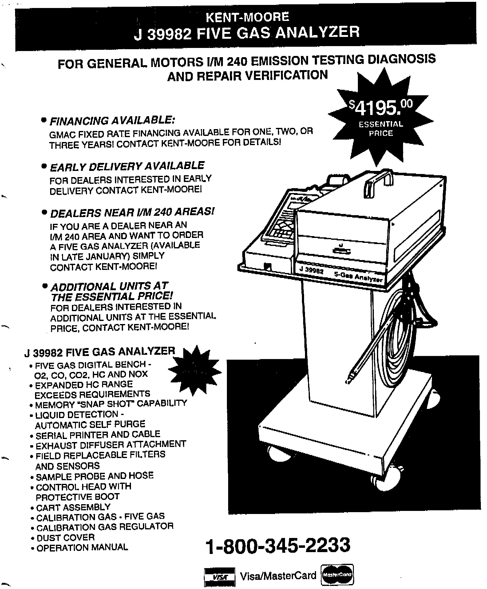 Included in this bulletin is information from Kent-Moore concerning the exhaust gas analyzer, financing terms, early delivery program, and additional units. They will be sent in a timely fashion relative to the program's implementation date in your area. Those dealerships located outside an