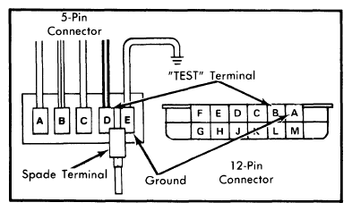 1. Turn ignition on (engine off). "CHECK ENGINE" lamp should glow. Locate Assembly Line Data Link (ALDL) connector attached to ECM wiring harness under instrument panel. Insert lug terminal across "TEST" terminal and "GROUND" terminal. See Fig 1.