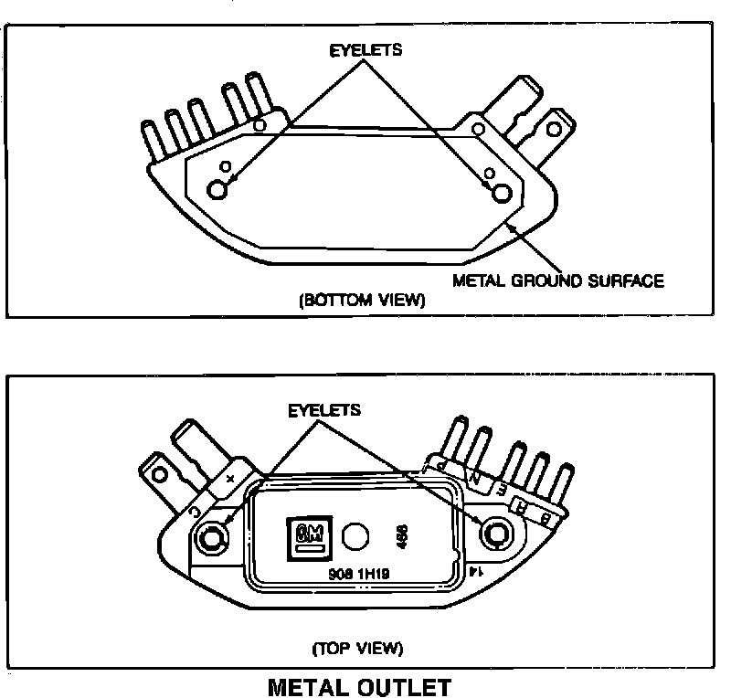 Known good HEI modules and new modules from service stock may fail a test using the HEI tester, J-24642, if the tester ground is improperly connected. When using the tester, connect or contact the alligator clip for the tester ground directly to the flat metal surface on the bottom of the HEI module (see illustrations). The metal eyelet on the module is not always in contact with the metal ground surface on the bottom on the module and, therefore, should not be used when testing the module.