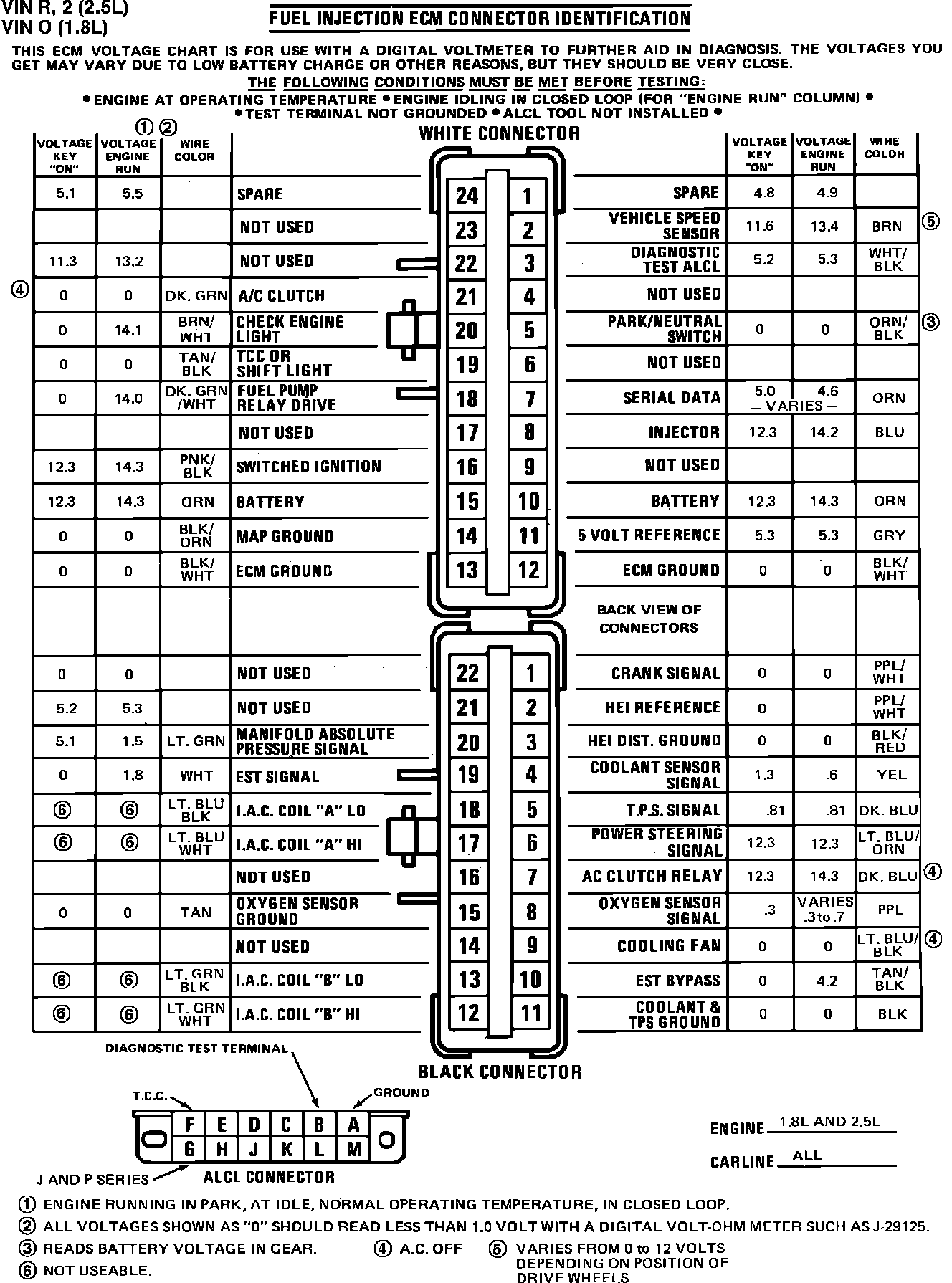 Fig. 002 ECM Connector Terminal I.D. & Volt. Specifications: