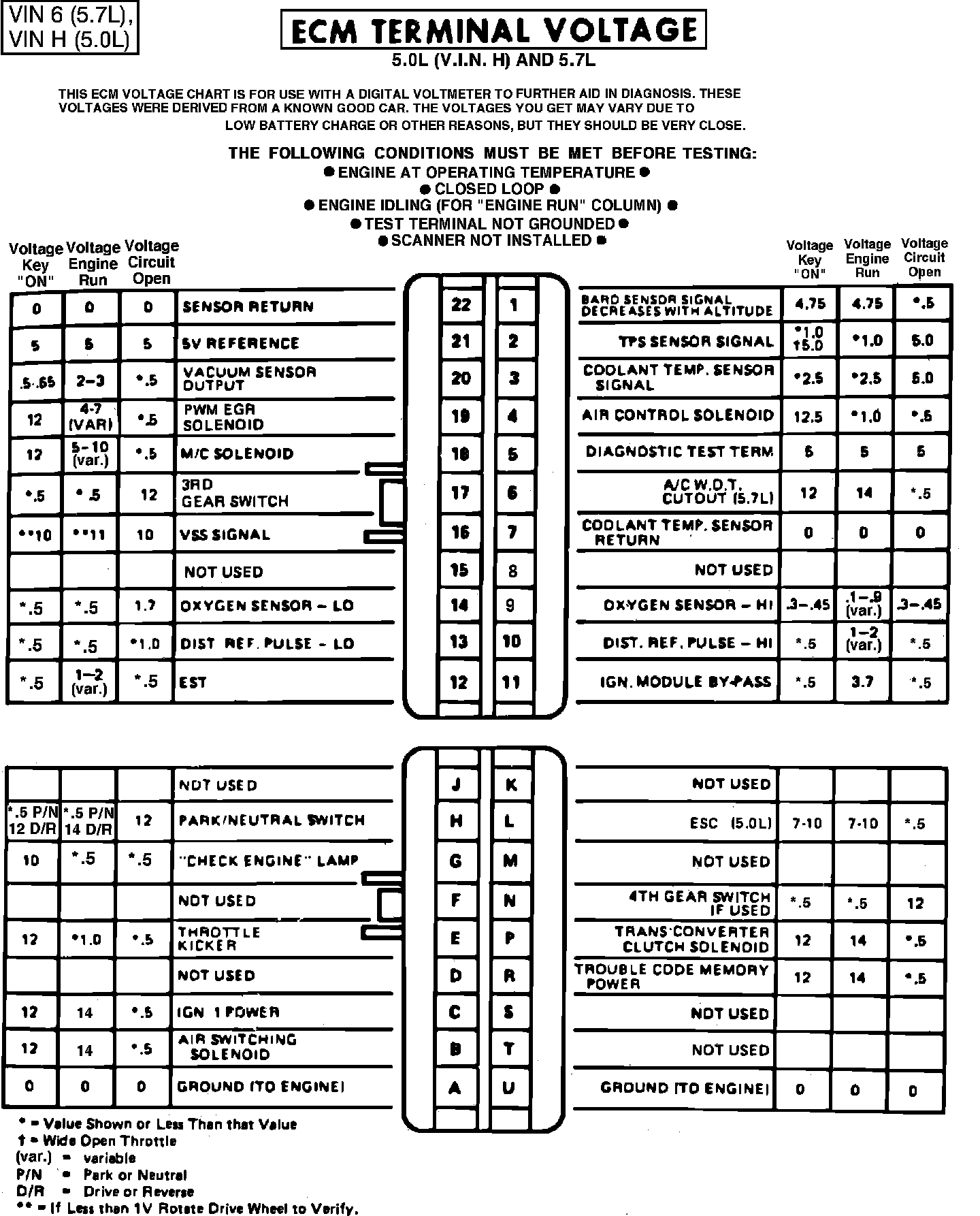Fig. 026 - ECM Connector Terminal Identification & Voltage Specifications.: