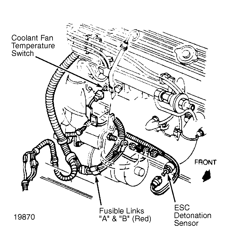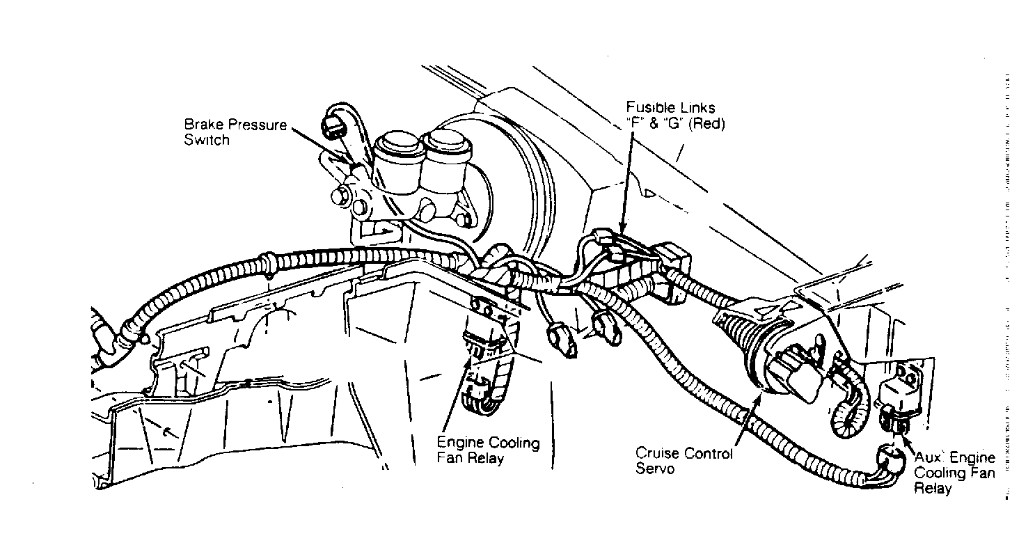 Fusible Links "F" & "G" (Red) At connector, in left rear corner of engine compartment. See Figure.