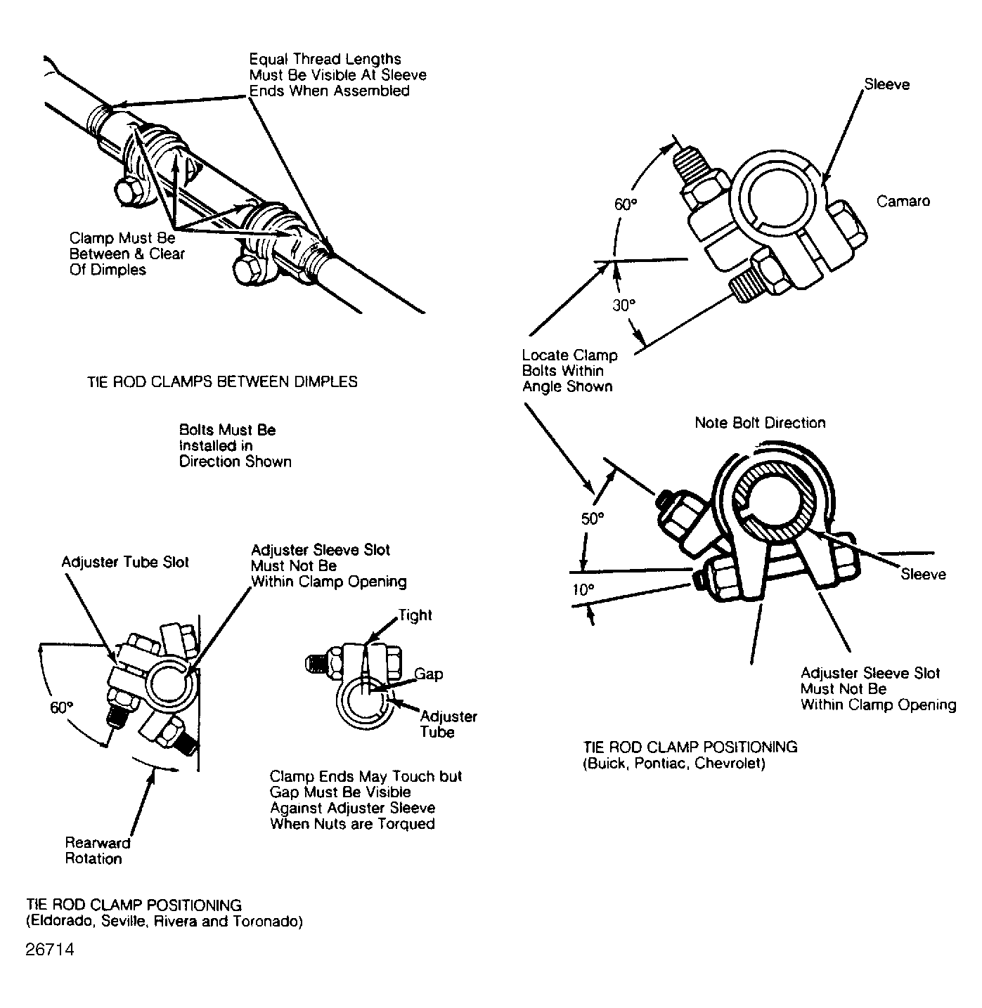 - With adjustment completed, check number of threads showing on each end of sleeve are equal and tie rod end housing is at right angles to steering arm. Position tie rod clamps and sleeves. See Figure . Tighten to specifications. On rack and pinion models tighten jam nut when set to specifications.
