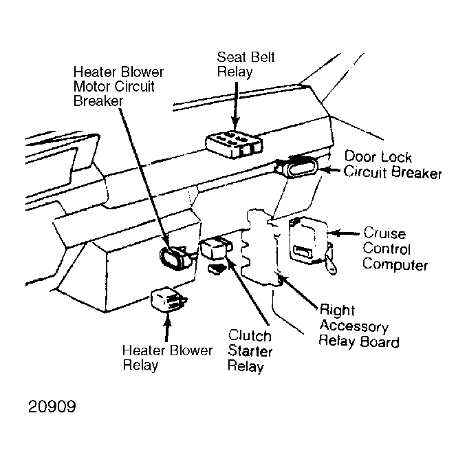 | Circuit Breakers Heater Blower Motor | On right accessory relay board. See Figure . |