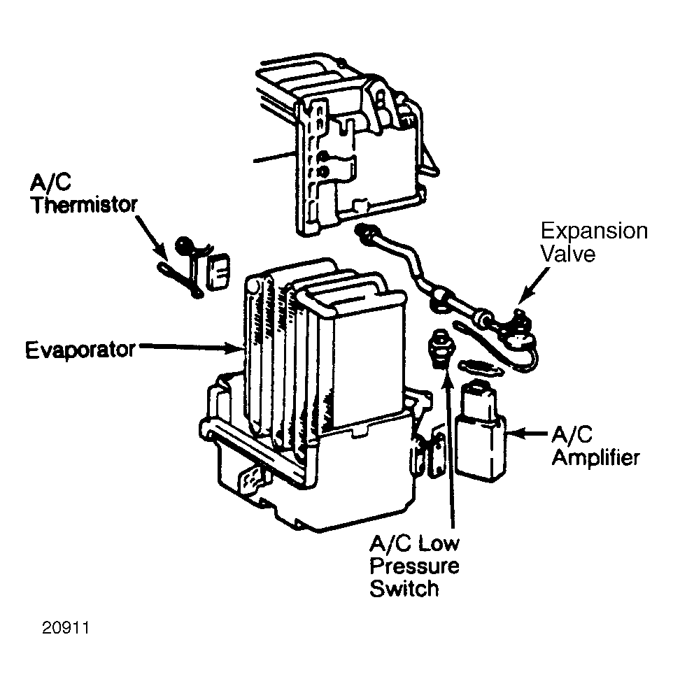 | A/C Amplifier | Under dashboard on side of evaporator housing. See Figure . |