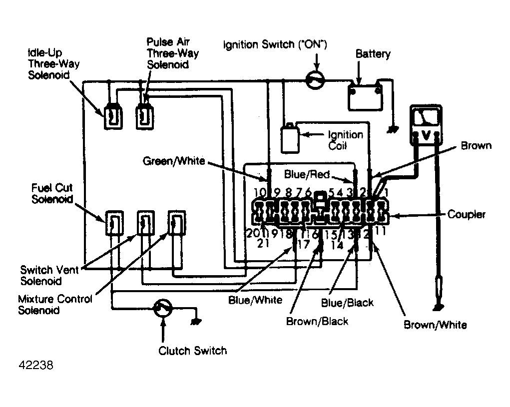 3. Check clutch switch operation as follows: Connect voltmeter between terminal No. 13 and ground. Depress clutch pedal fully. Voltage should drop to zero, indicating clutch switch is "ON" and terminal is grounded. Reconnect coupler to ECM.
