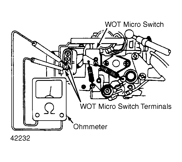 - Remove air cleaner and carburetor. Connect ohmmeter to wide open throttle (WOT) micro switch. See Fig 1 . Check that resistance between micro switch terminals is infinity.
