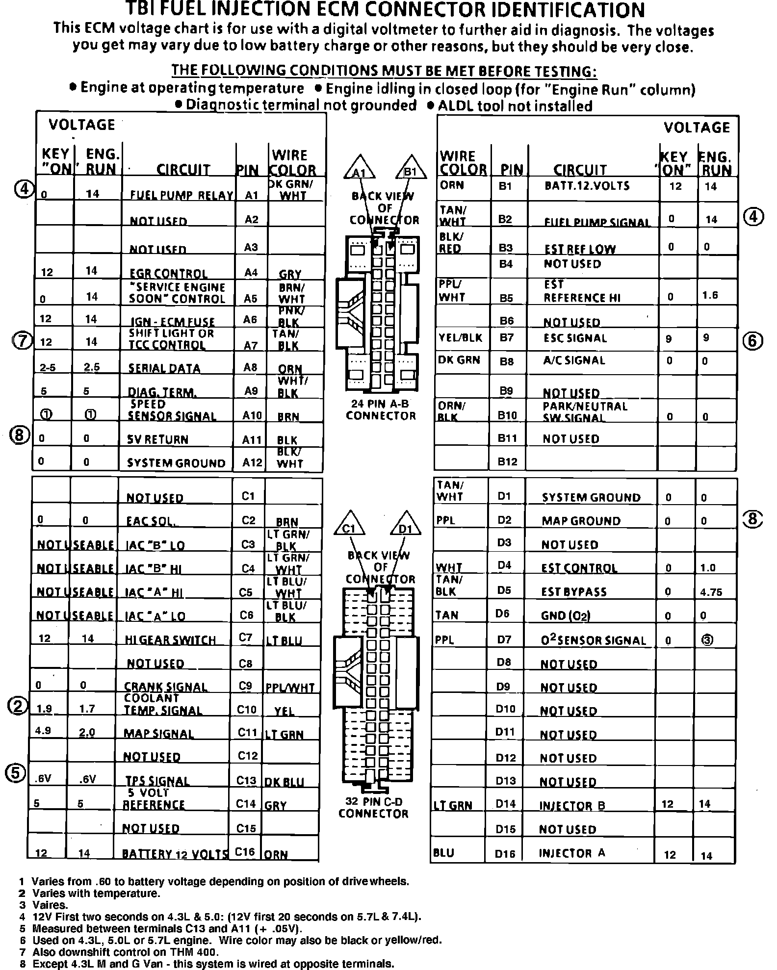 ECM Connector Terminal Identification & Voltage Specifications.: