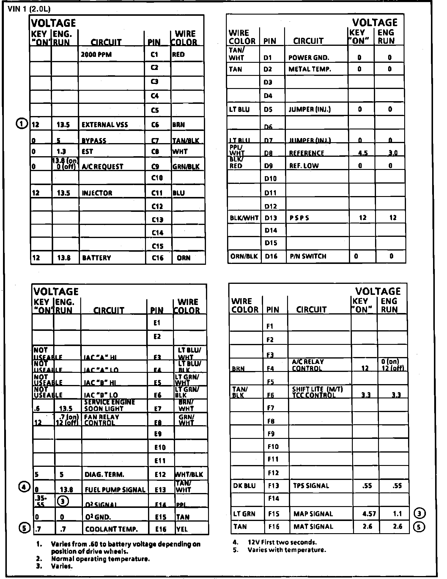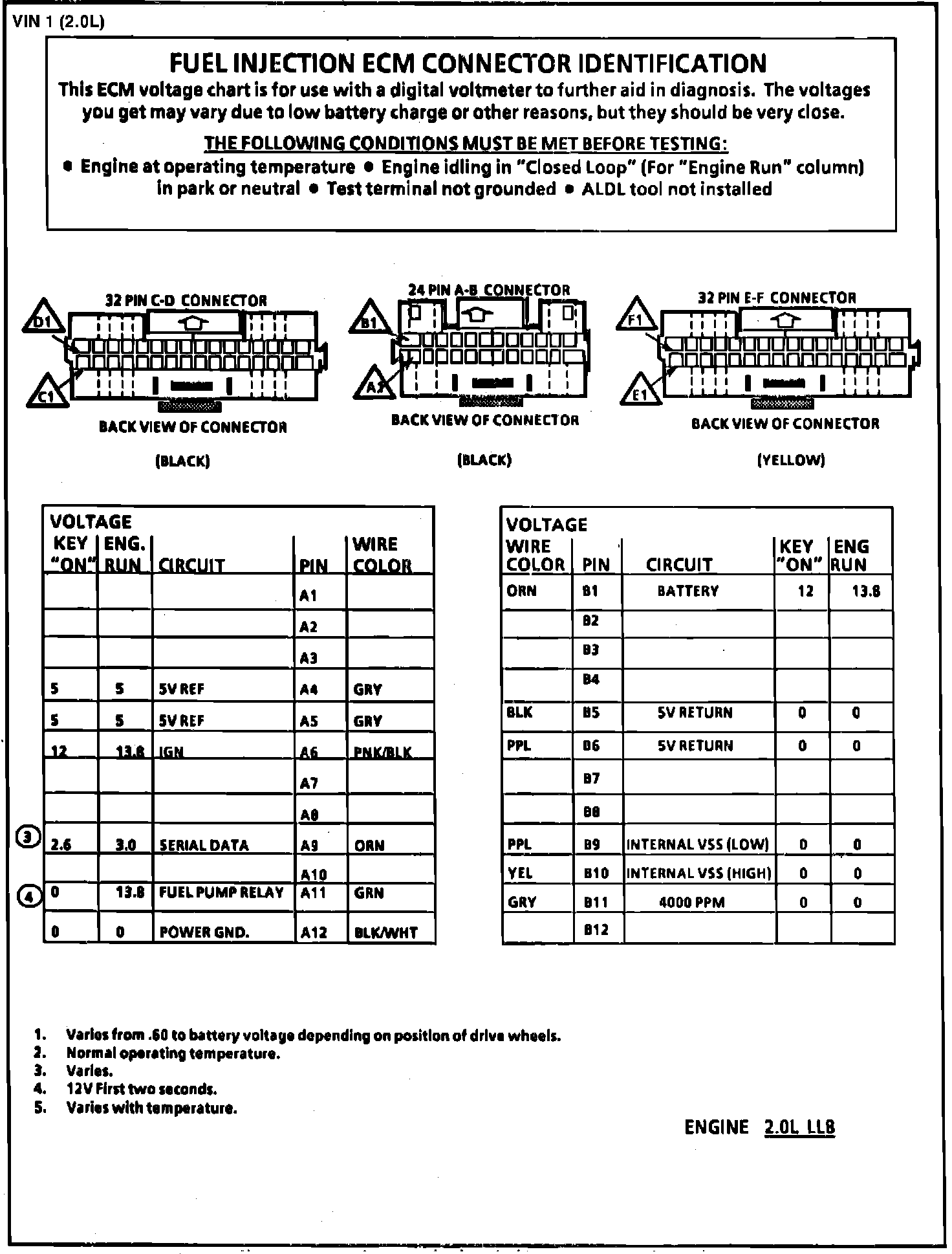 Fig. 011 ECM Connector Terminal I.D. & Volt. Specifications (2 of 2):