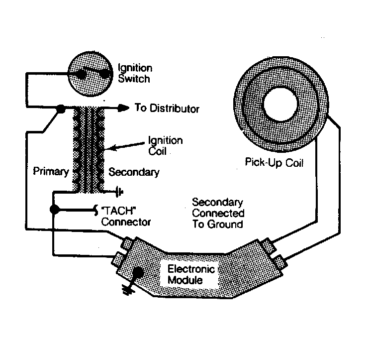 The timer core mounted on the distributor shaft, rotates with the shaft inside the pole piece portion of the pick-up coil assembly. When the external teeth of the trigger wheel line up with the internal teeth of the pole piece, a voltage is induced in the pick-up coil. This signals the electronic module inside the distributor, which opens the ignition coil primary circuit. See Fig 1.