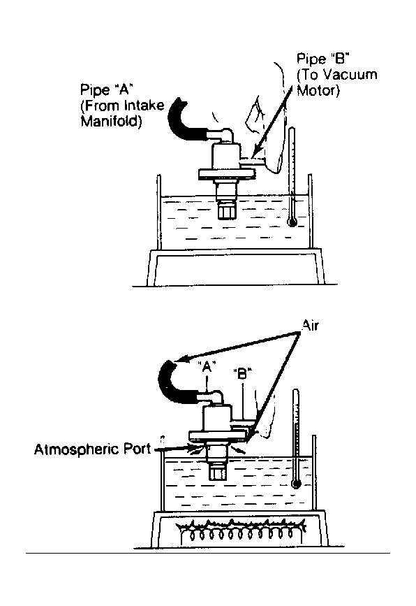 . Ensure air does not flow through atmospheric port. Heat ITC valve to about 113°F (45°C) in hot water. Do not allow water inside valve. Blow air into pipe "A". Close pipe "B". Ensure air flows through atmospheric port.