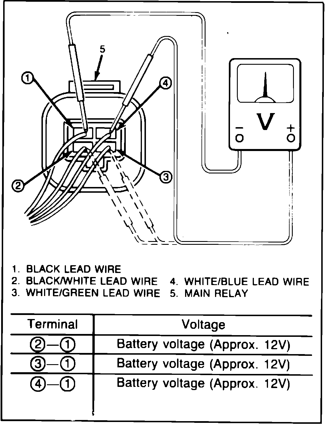 2. With ignition switch ``On,'' check voltage between terminals as indicated, Fig. 16. The same component is used for main and fuel pump relay. To identify main relay, check lead wire for black, black/white, white/blue, and white/green wire.