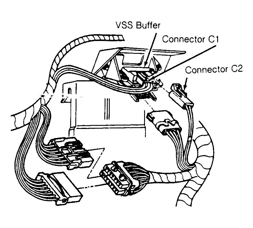 2. Turn ignition off. Remove tester from VSS. Disconnect VSS buffer located behind instrument panel, above convenience center. See Fig 1 . Connect Instrument Panel Tester (J 33431-B) to terminal "F" (Dark Green wire) of VSS buffer connector C1.