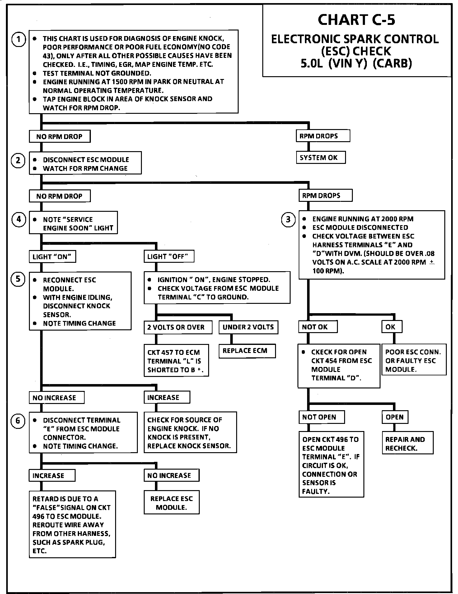 4. "SERVICE ENGINE SOON" light should be "ON" and a Code 43 set because ESC system would be retarded too long. If no light "ON," the ECM is not retarding the spark because of a voltage on CKT 457 to terminal "L" or the ECM is faulty.