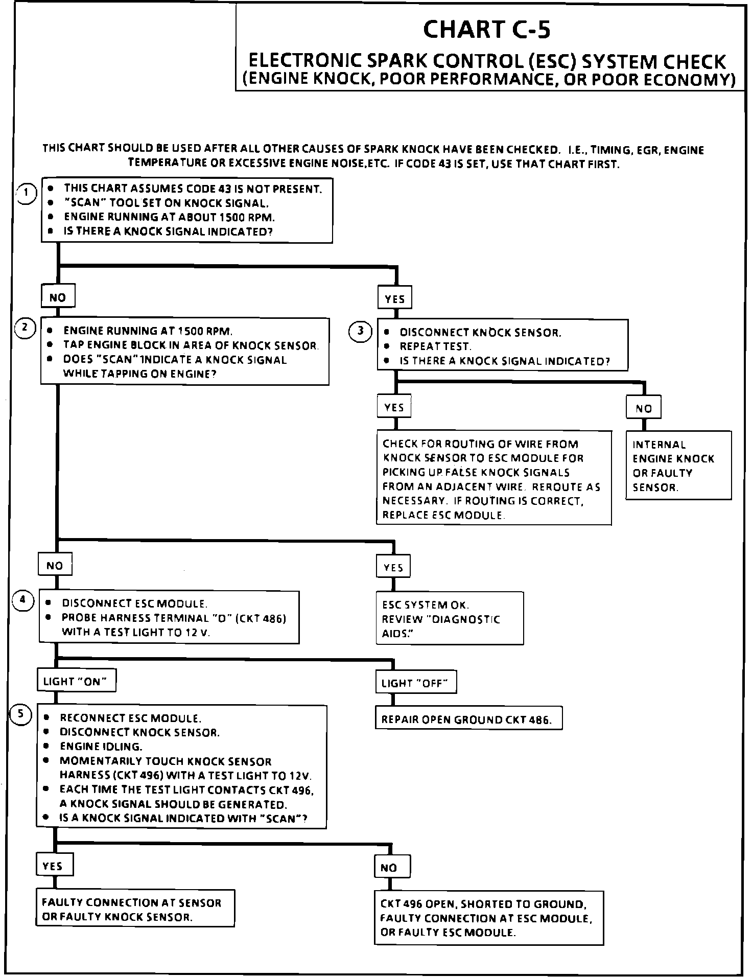 5. Contacting circuit 496, with a test light to 12.0 volts, should generate a knock signal to determine whether the knock sensor is faulty, or the ESC module can not recognize a knock signal.