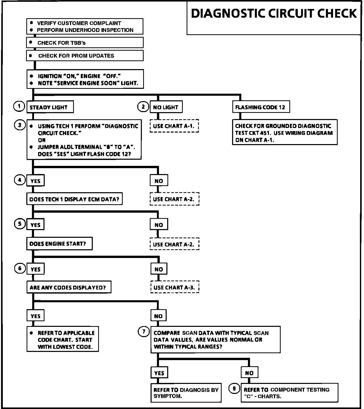 The diagnostic circuit check is an organized approach to identifying a problem created by an electronic engine control system malfunction. It must be the starting point for any driveability complaint diagnosis, because it directs the service technician to the next logical step in diagnosing the complaint. Understanding the chart and using it correctly will reduce diagnostic time and prevent the unnecessary replacement of good parts.