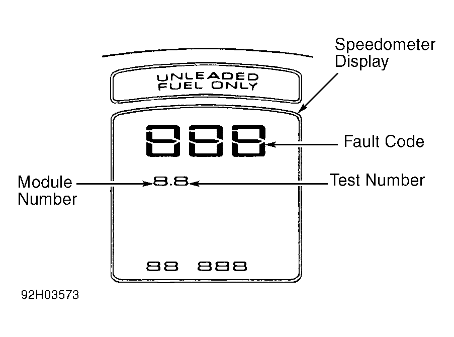 The speedometer is used to display fault codes for CCM, Electronic Control Module (ECM) and ABS/ASR system. The trip monitor is used to display module number and test number. The first digit identifies module number. The second digit identifies test number. See Fig 1. For trip monitor number display identification, see TRIP MONITOR DISPLAY table.