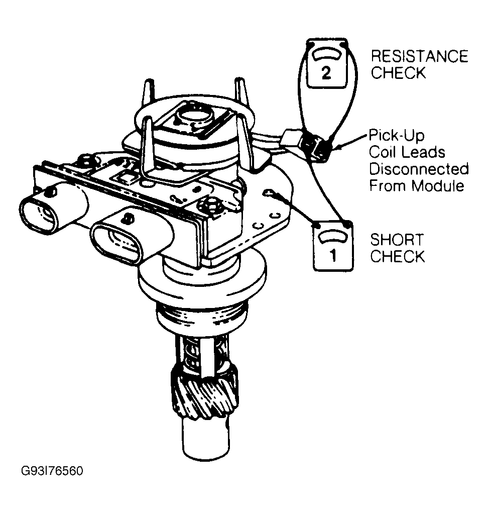 - Disconnect pick-up coil leads from module. Using ohmmeter, check pick-up coil resistance. Connect ohmmeter to distributor housing and either pick-up coil lead (step 1 in illustration). See Fig 1. Flex pick-up coil leads by hand to check for intermittent short to ground. If reading is not always infinite, replace pick-up coil.