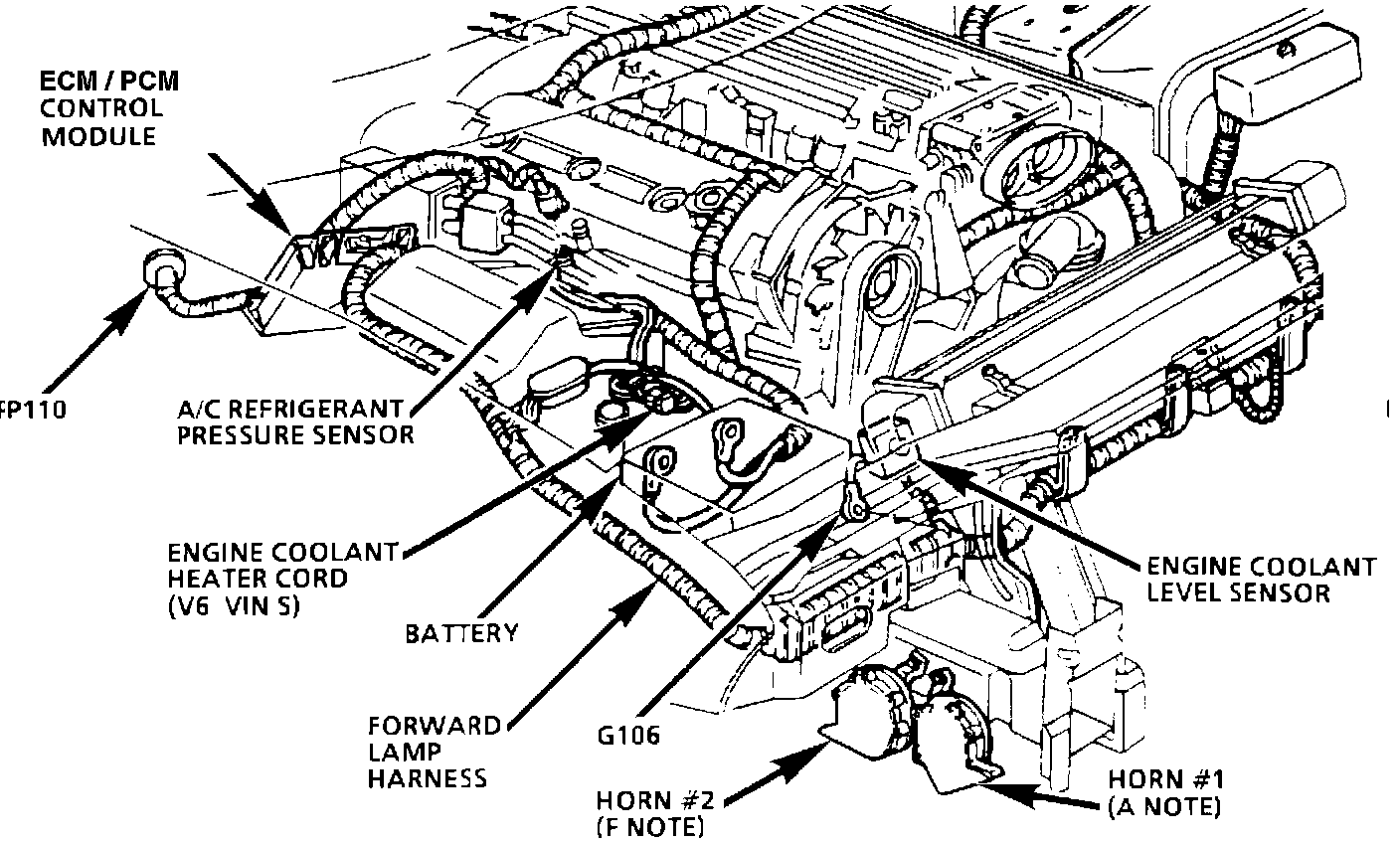 The powertrain control module (PCM) is located in the engine compartment, rearward of the right hand shack tower.