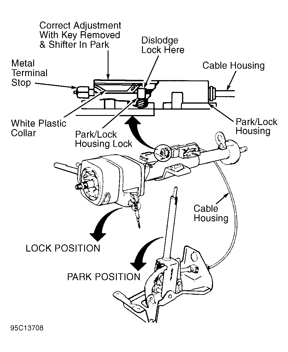 - If system does not perform as described, dislodge park lock cable housing lock at ignition switch. Adjust outer cable housing to position White plastic collar in park lock housing. See Fig 1 .