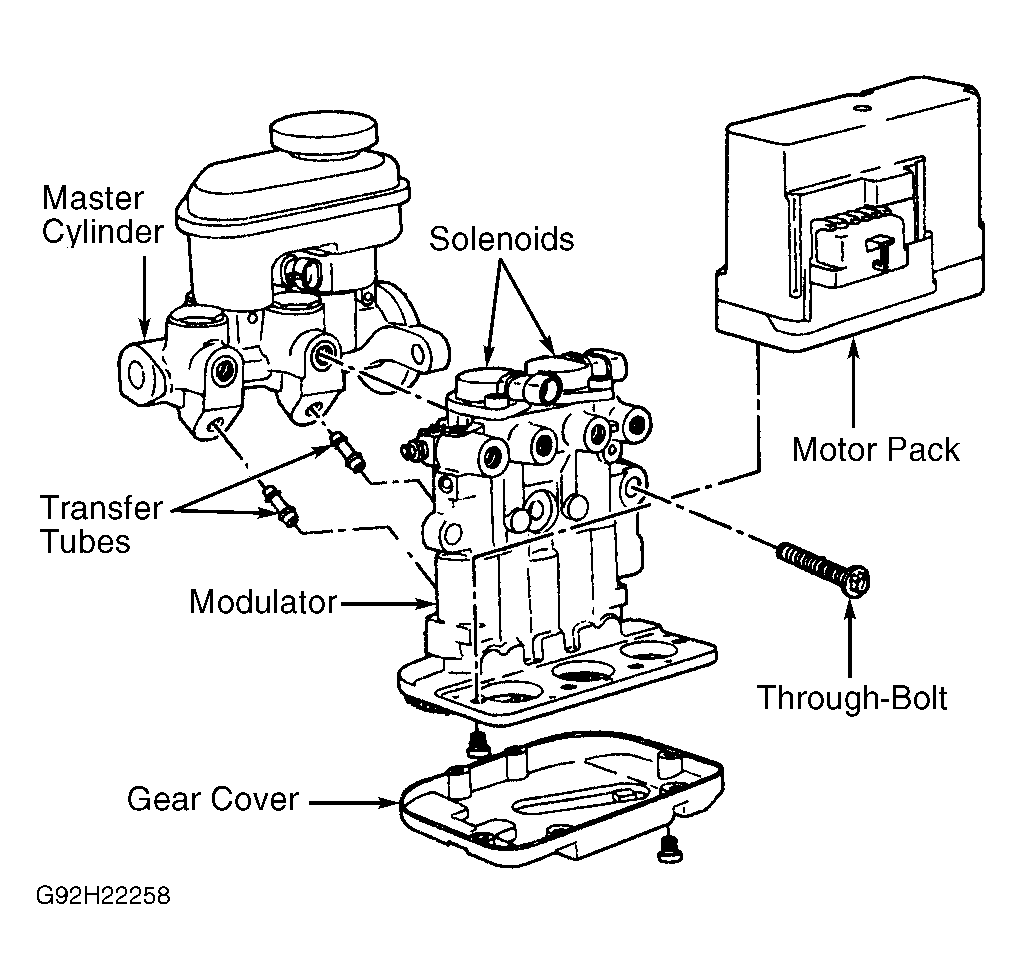 - Remove 2 ABS modulator-to-master cylinder through bolts and "O" rings. Separate master cylinder from ABS modulator. Remove 2 transfer tubes and "O" rings from master cylinder or ABS modulator. See Fig 1 . If ABS modulator is being replaced, ensure gears are installed in same location on replacement ABS modulator. See ABS/TCS MODULATOR GEARS .