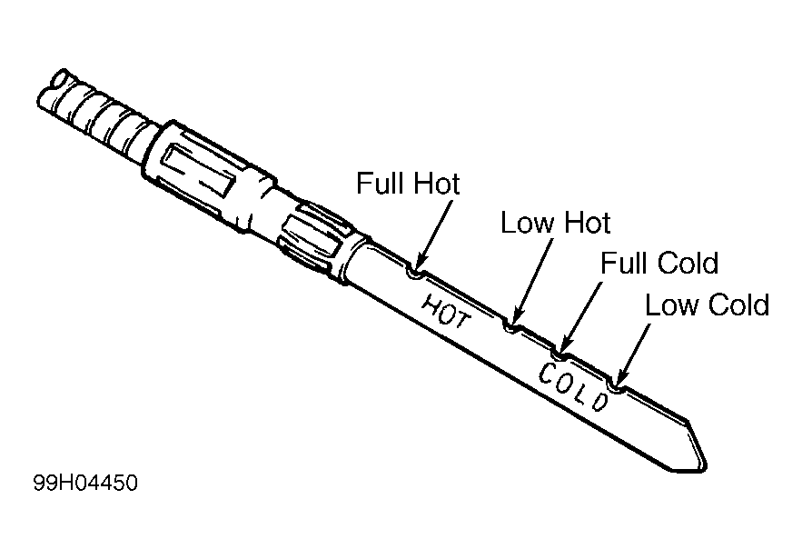 - Remove transaxle dipstick, wipe clean, and fully reinsert into filler tube. Remove dipstick again and inspect fluid level. Fluid level should be between FULL HOT and LOW HOT marks, or within HOT area defined by upper and lower notches on dipstick. See Fig 1.