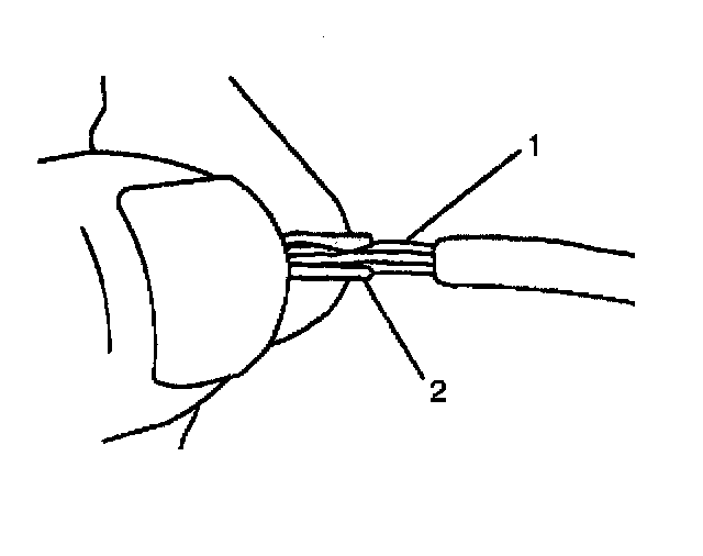 7. Center the splice clip (2) over the stripped wires (1) and hold the clip in place.