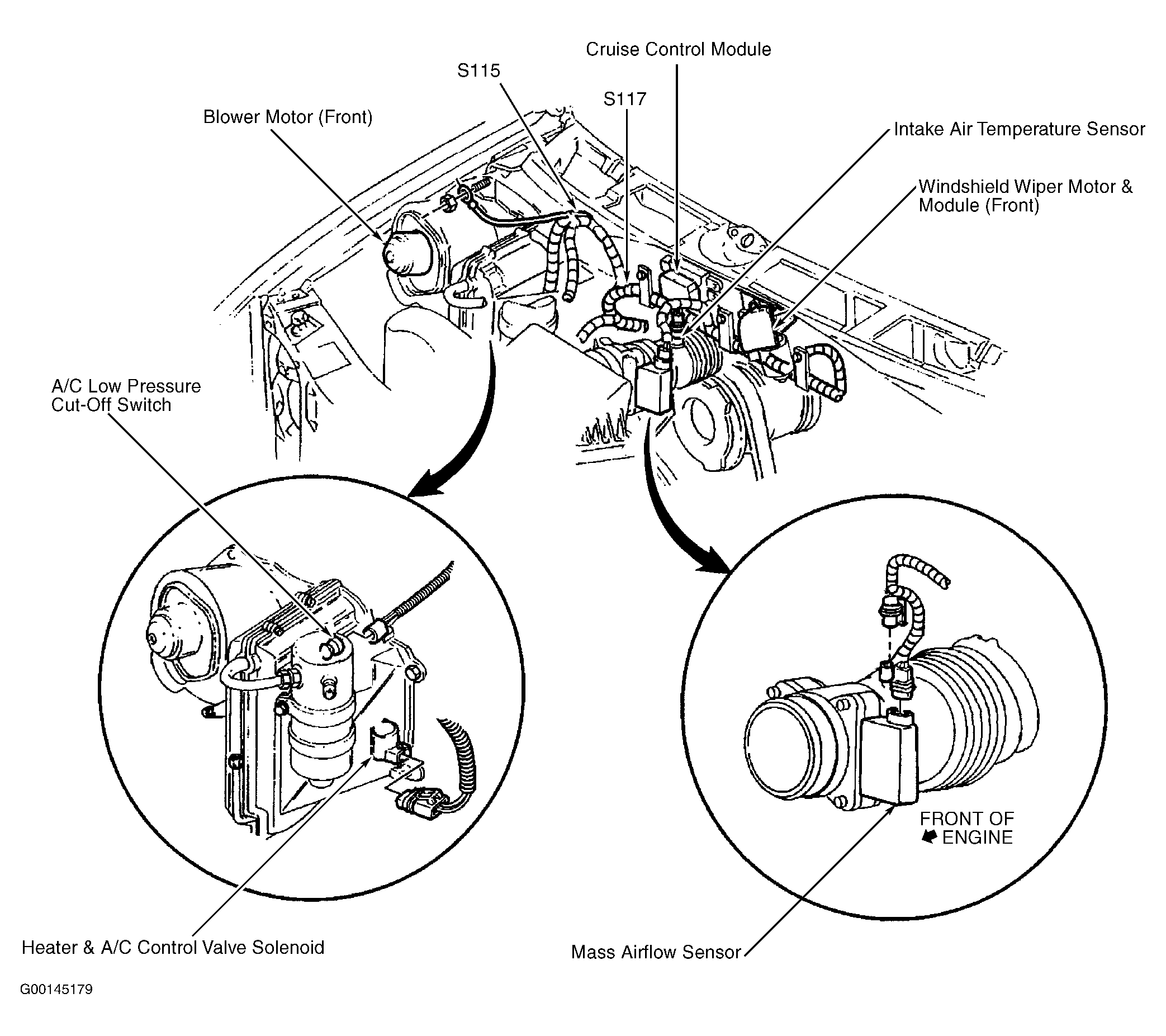 | Cruise Control Module | Center front of firewall, left of windshield wiper module. See Figure. |