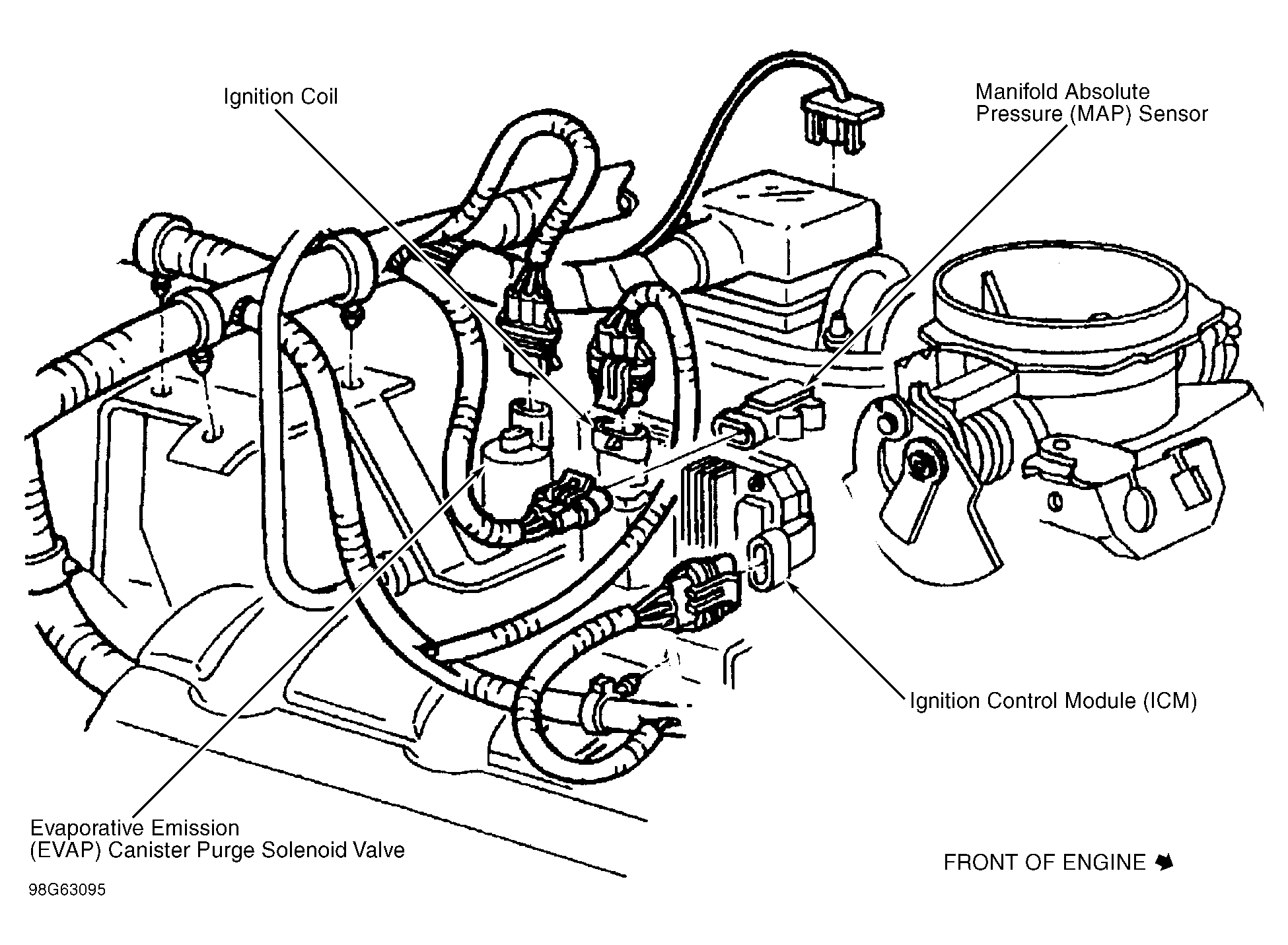 | Ignition Control Module (ICM) | Top of engine, front of coil. See Figure. |