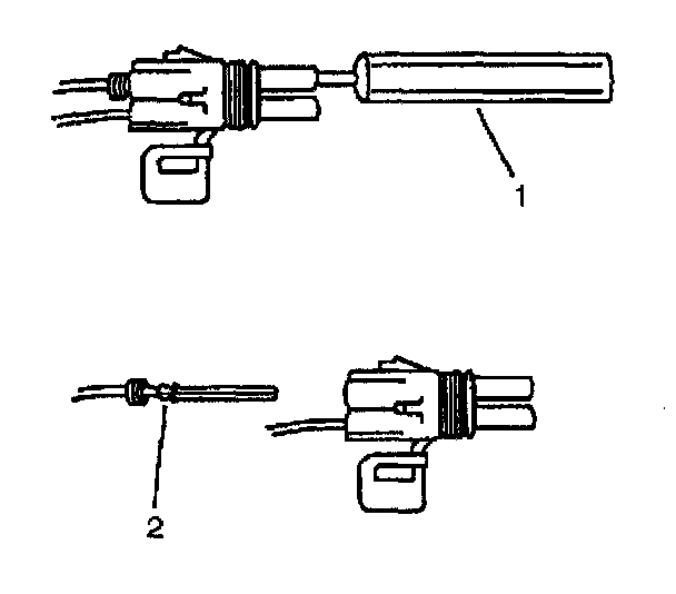 ^ Insert the Weather Pack� terminal removal tool into the front (mating end) of the connector cavity until it rests on the cavity shoulder (1).