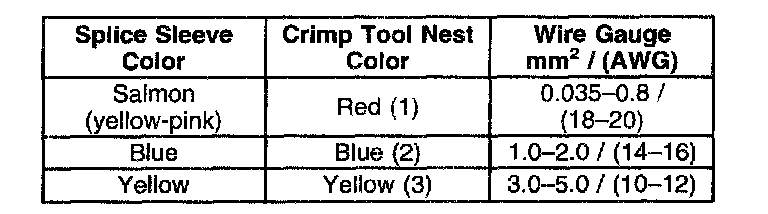 4. Select the proper sealed splice sleeve according to the wire size. Refer to the above table at the beginning of the repair procedure for the color coding of the splice sleeves and the crimp tool nests.