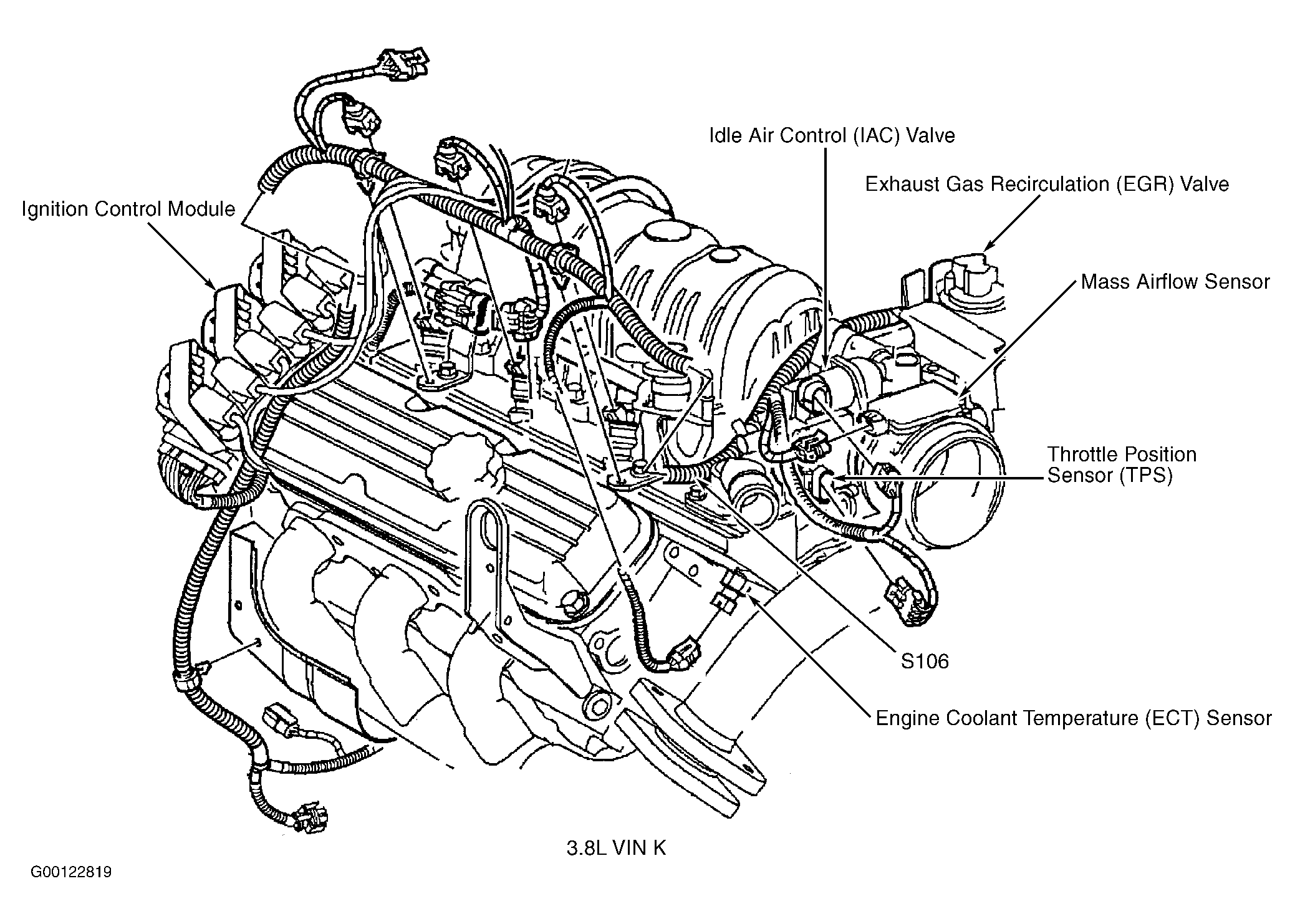 | S109 (3.8L VIN K) | Engine wiring harness, top of engine at IAT sensor breakout. |