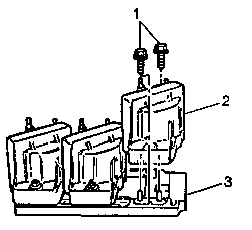 2. Attach the coils (2) to the ignition control module (3) and install 6 ignition coil attaching screws (1).