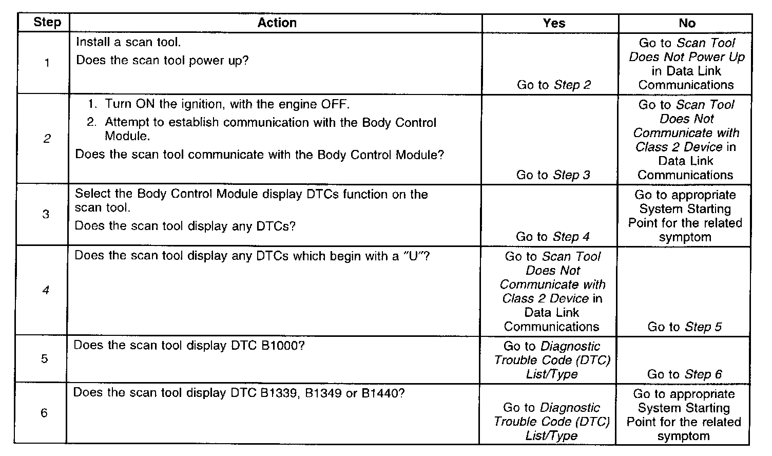 Home >> Chevrolet >> 2000 >> Impala V6-3.8L VIN K >> Repair and Diagnosis >> Relays and Modules >> Relays and Modules - Powertrain Management >> Relays and Modules - Computers and Control Systems >> Body Control Module >> Testing and Inspection >> Initial Inspection and Diagnostic Overview >> A Diagnostic System Check - Body Control System