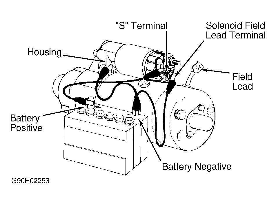 - Connect another lead from negative battery terminal to starter drive housing. Connect lead from positive battery terminal to solenoid "S" terminal.